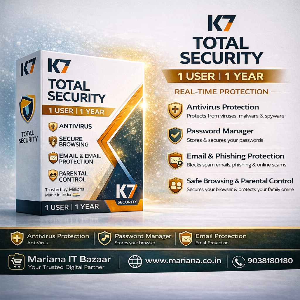 K7 Total Security 1 User 1 Year is a comprehensive cybersecurity solution designed to protect your PC from viruses, malware, ransomware, phishing attacks, and other online threats. It provides complete digital protection by combining antivirus, internet security, and advanced privacy features in one powerful package.